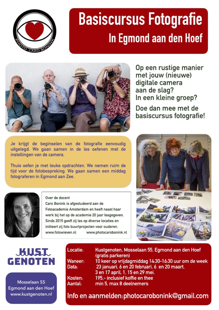De fotoworkshops zijn lessen die op diverse locaties in Amsterdam en sinds kort in Egmond aan den Hoef op een relaxte manier gegeven worden. Techniek is belangrijk, maar kijken en creativiteit nog veel belangrijker. We oefenen vaak met elkaar in de les, binnen of op locatie. Wij nemen veel tijd om de beelden te bespreken.