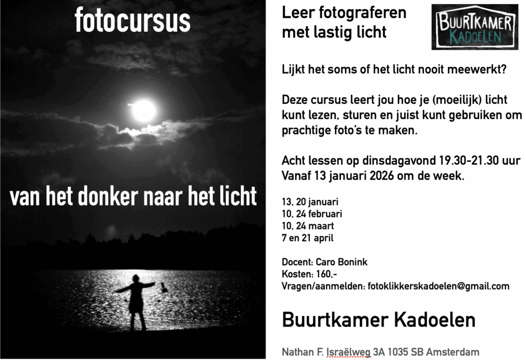 De fotoworkshops zijn lessen die op diverse locaties in Amsterdam en sinds kort in Egmond aan den Hoef op een relaxte manier gegeven worden. Techniek is belangrijk, maar kijken en creativiteit nog veel belangrijker. We oefenen vaak met elkaar in de les, binnen of op locatie. Wij nemen veel tijd om de beelden te bespreken.